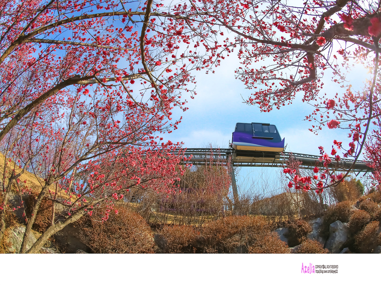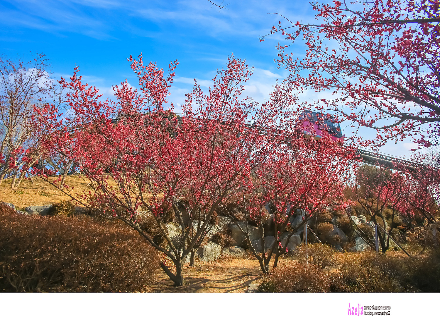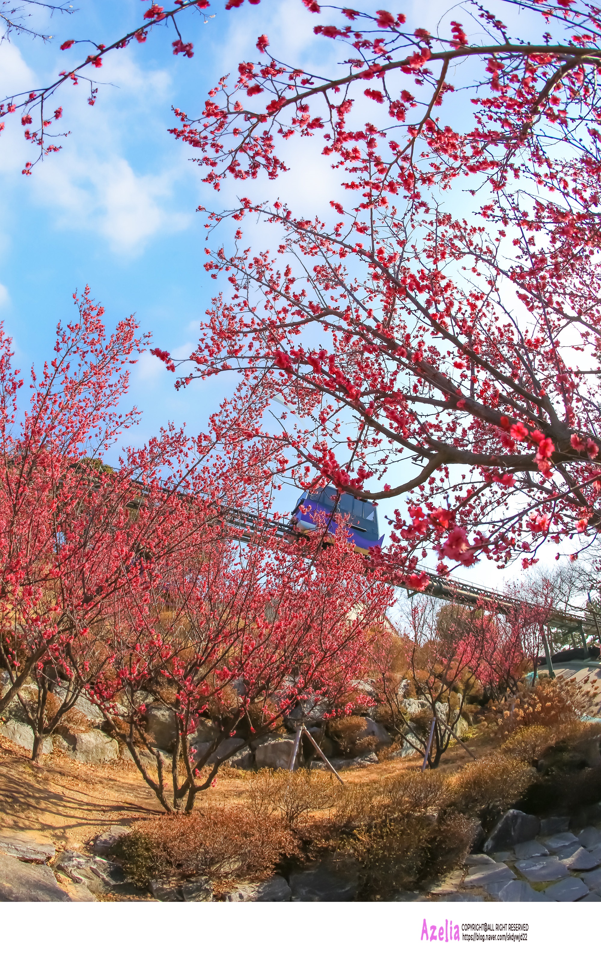 모노레일이 지나가는 곳에 활짝 핀 홍매화와 매화꽃은 모노레일을 타면서도 홍매화 구경을 하기도 좋은 곳이다