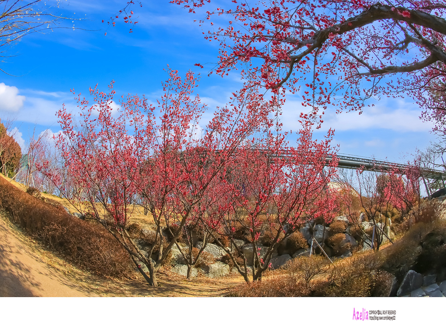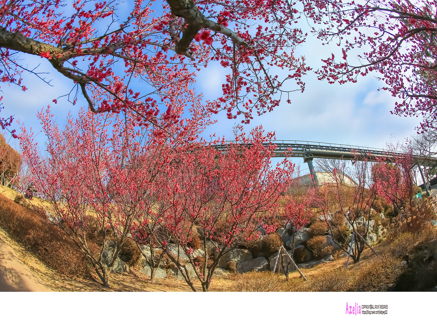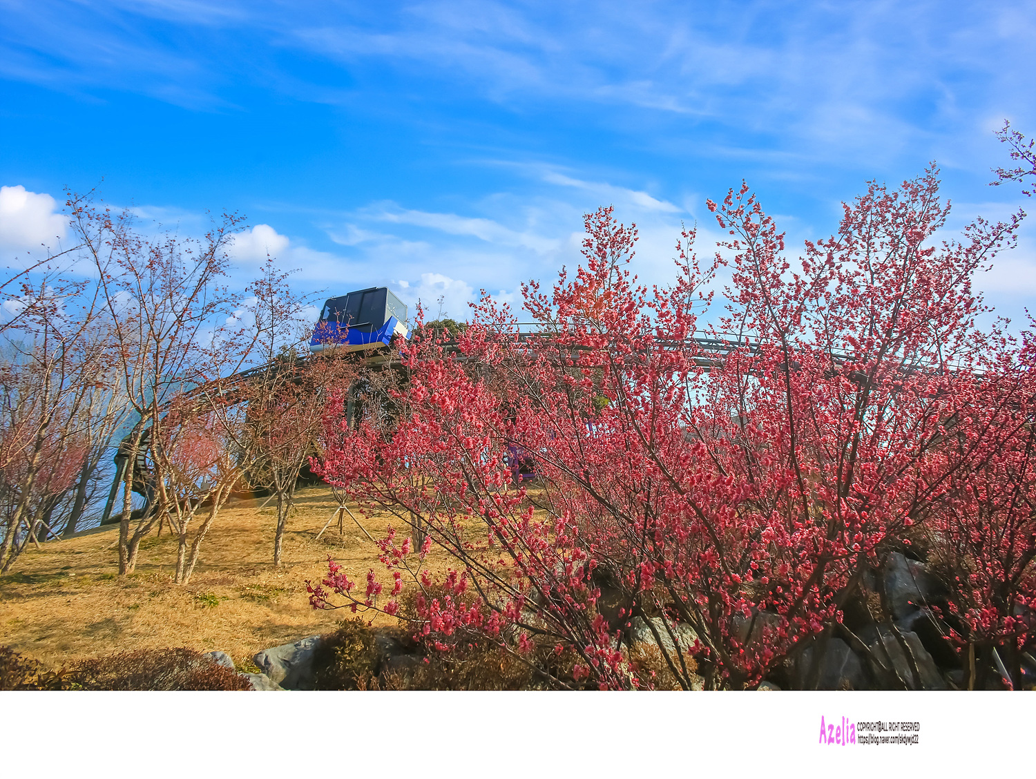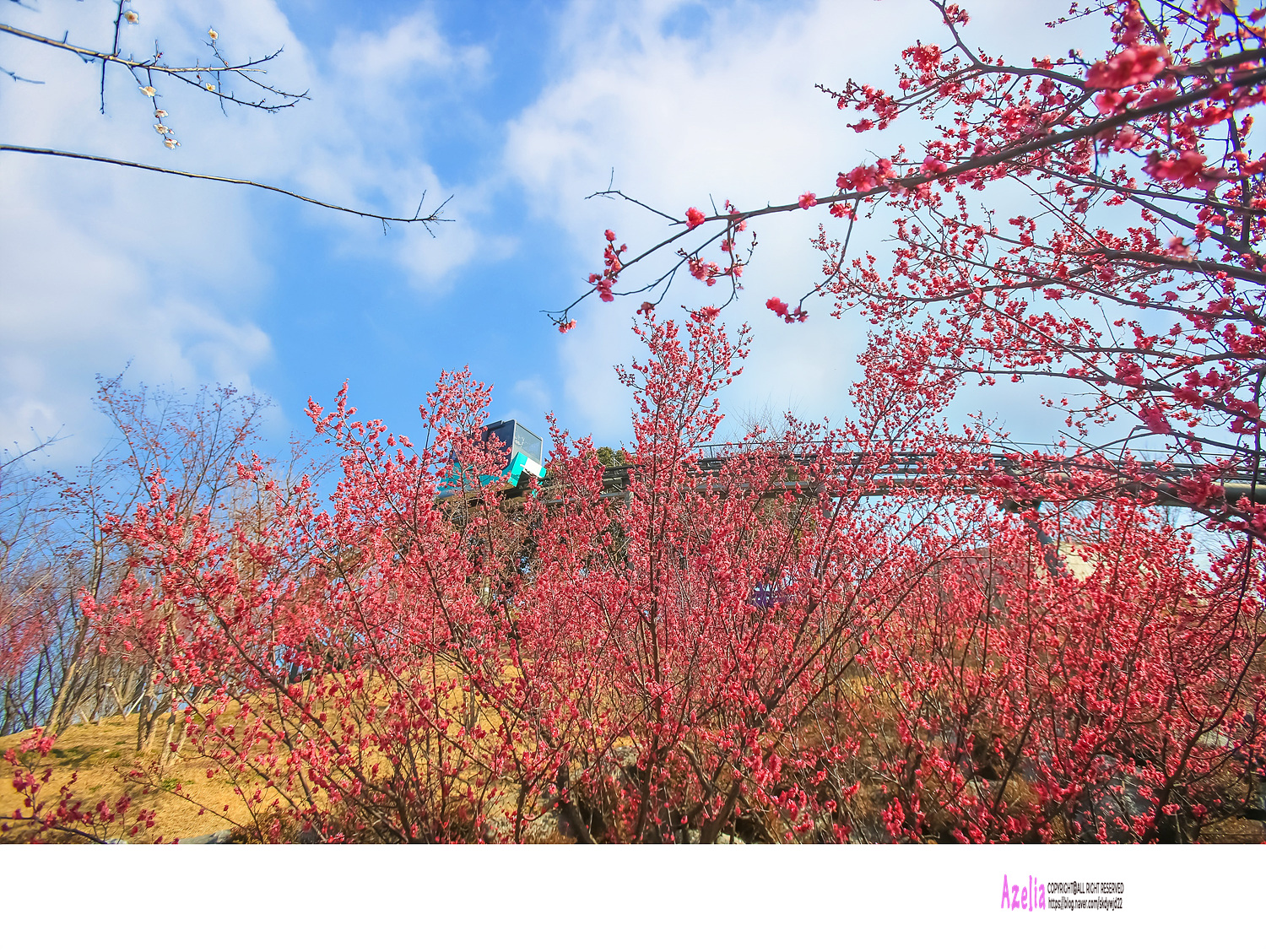 모노레일이 지나가는 곳에 활짝 핀 홍매화와 매화꽃은 모노레일을 타면서도 홍매화 구경을 하기도 좋은 곳이다